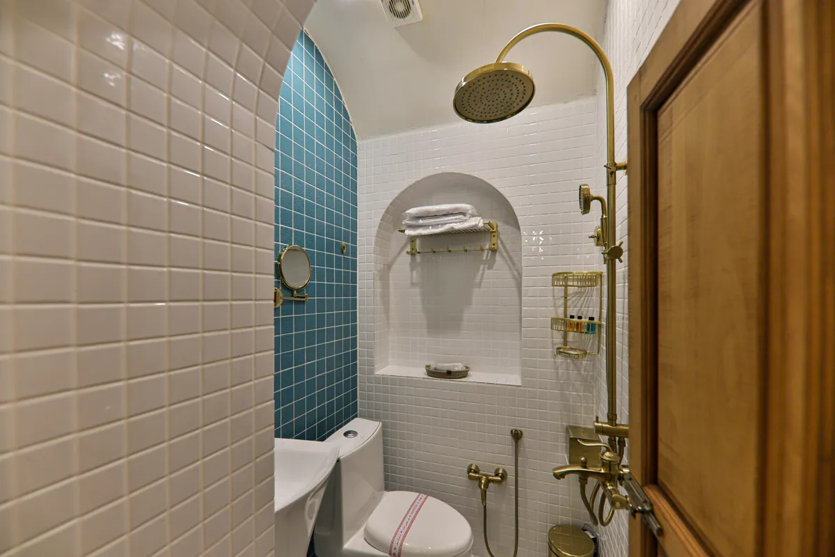 جایجای پنجرهها و سقف اتاق مینشیند، نمادی از آرامش را به مهمانان هدیه میدهد. این آبی آسمانی،