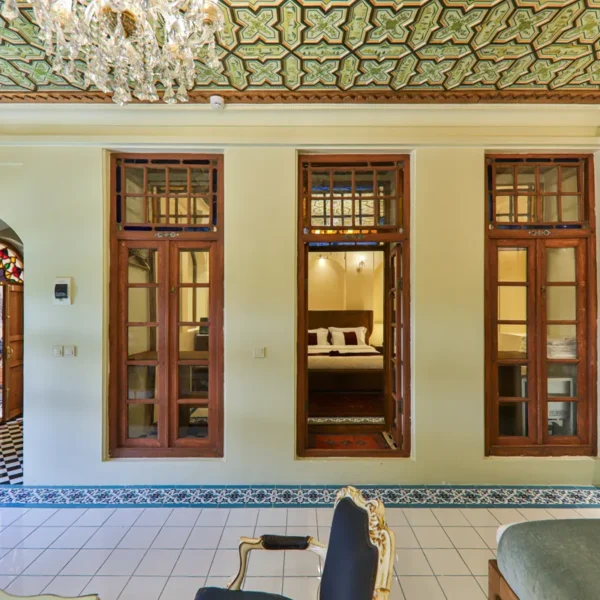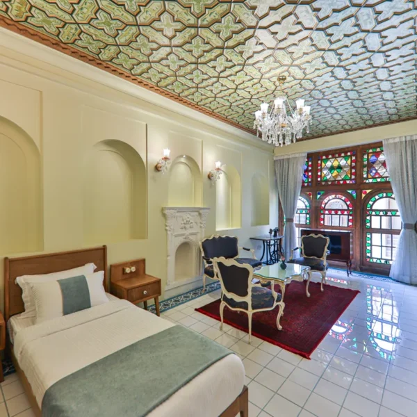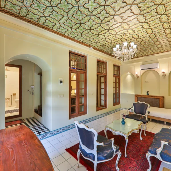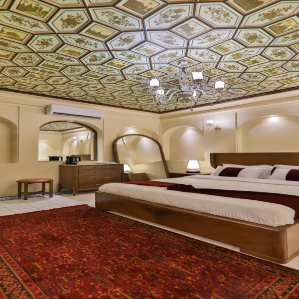 • دکوراسیونی با معماری ایرانی: سقفهای چوبی منبتکاری شده، طاقنماهای قوسدار با نورپردازی ملایم و پردههای رنگی و شیشههای سنتی نور طبیعی را به شکلی هنرمندانه وارد اتاق میکنند و فضایی رویایی و دلنشین میسازند.