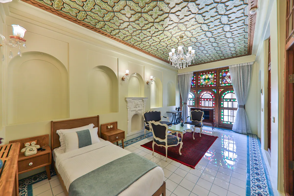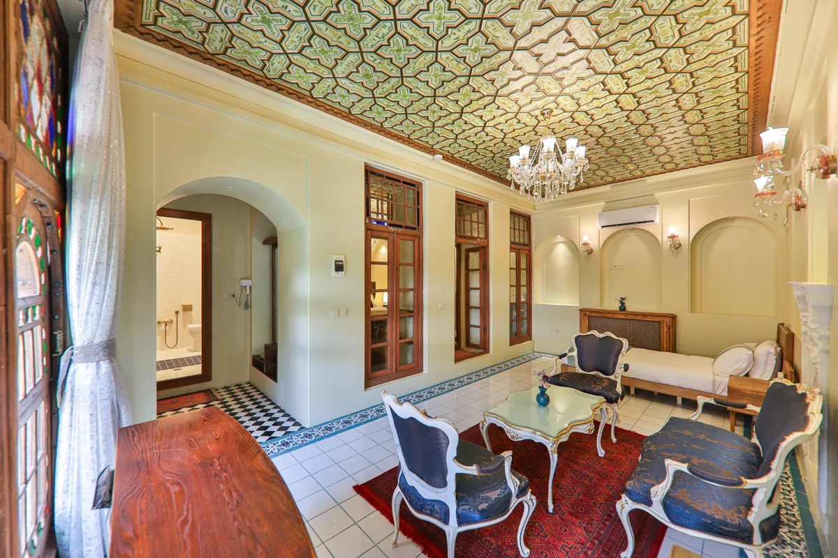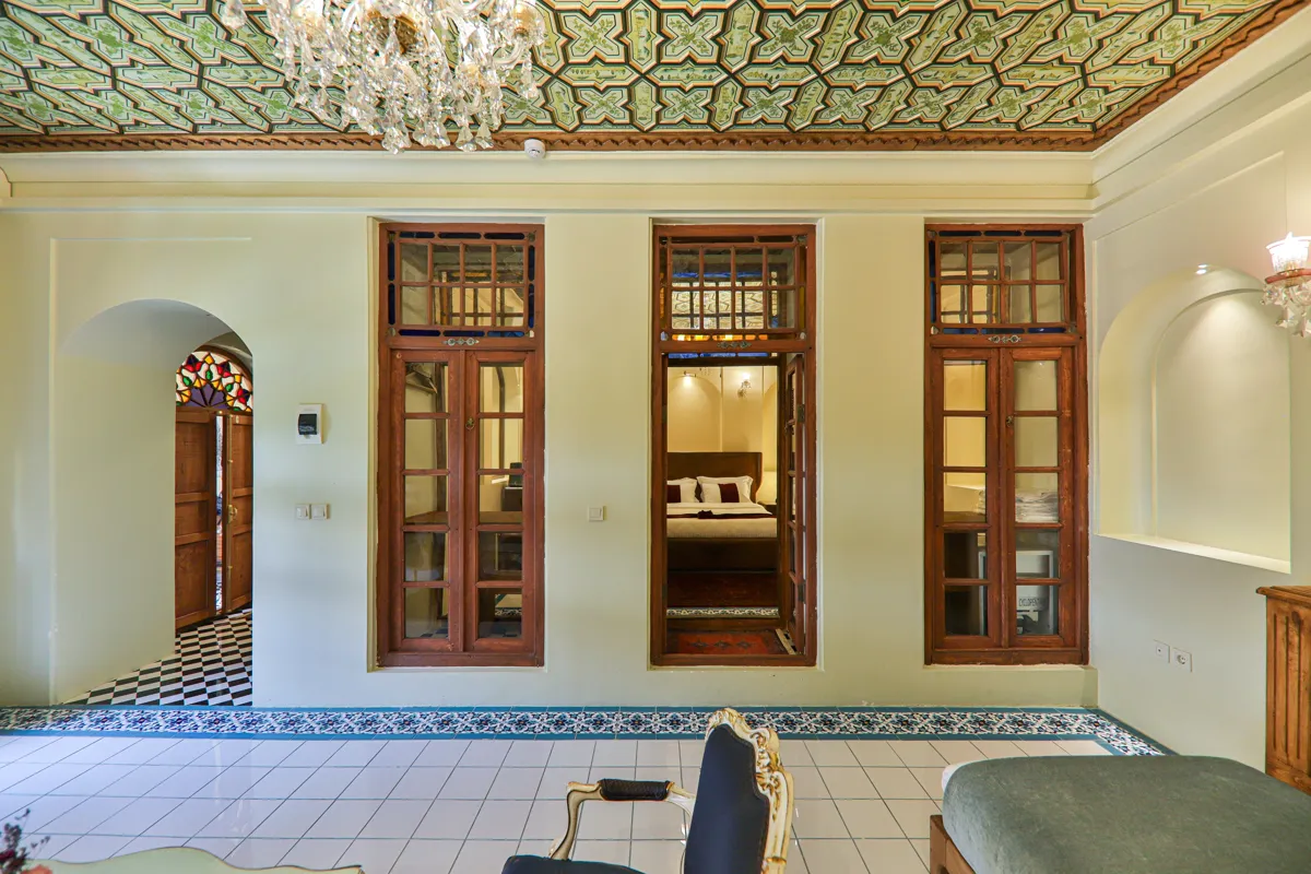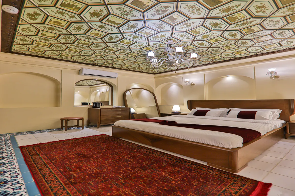 • دکوراسیونی با معماری ایرانی: سقفهای چوبی منبتکاری شده، طاقنماهای قوسدار با نورپردازی ملایم و پردههای رنگی و شیشههای سنتی نور طبیعی را به شکلی هنرمندانه وارد اتاق میکنند و فضایی رویایی و دلنشین میسازند.