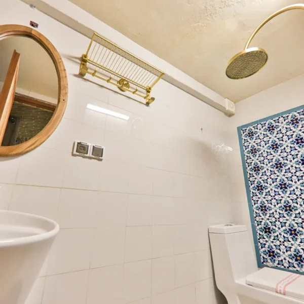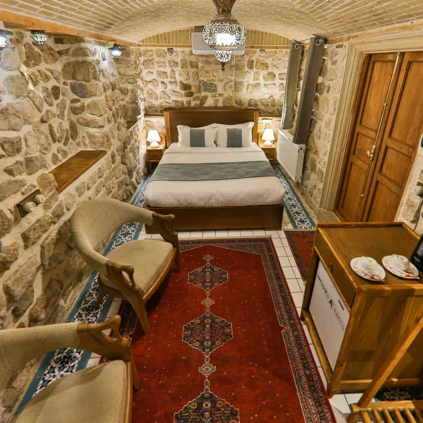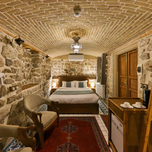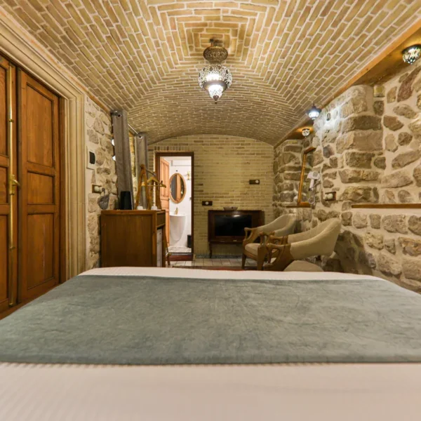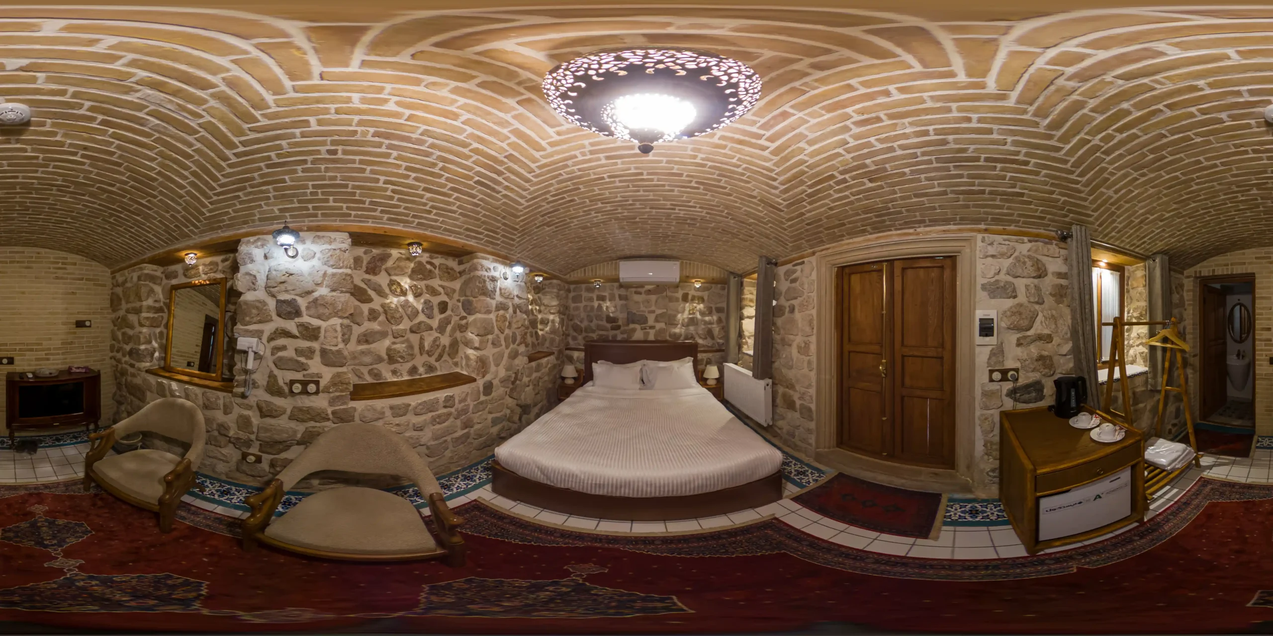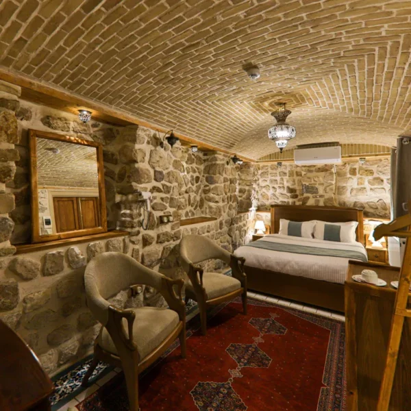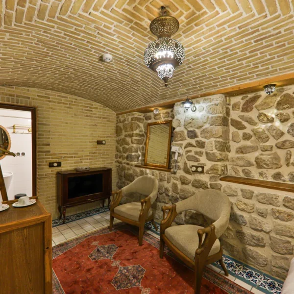 اتاق “وصال” با طراحی بینظیر خود، فضایی شاعرانه و دلنشین را برای اقامتی فراموشنشدنی فراهم کرده است. نام این اتاق از مفهوم وصال و پیوند الهام گرفته شده و نقاشیهای دیواری آن، مراسم عروسی سنتی ایرانی را با جزییاتی هنرمندانه به تصویر کشیدهاند. این نقاشیها که در قابهای طاقمانند بر روی دیوارها اجرا شدهاند، حس شکوه و اصالت را به فضا بخشیده و گویی داستانی عاشقانه را روایت میکنند. سقف اتاق یک شاهکار هنری است که با نقوش اسلیمی، گلوبوتههای ظریف و طرحهای الهامگرفته از هنر ایرانی مزین شده است. رنگهای گرم و ترکیب طرحهای سنتی، فضایی پر از حس نوستالژی و زیبایی خلق کرده است. شیشههای رنگی پنجرهها یکی دیگر از ویژگیهای برجسته این اتاق است.