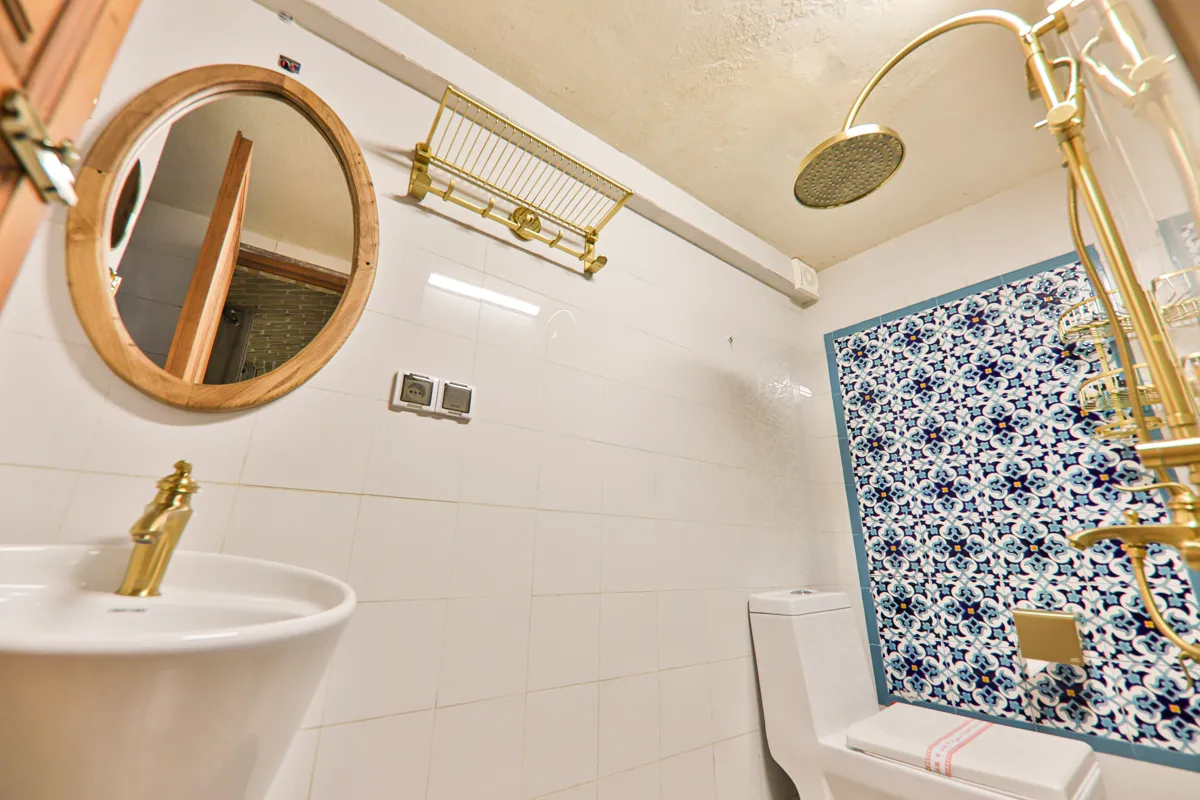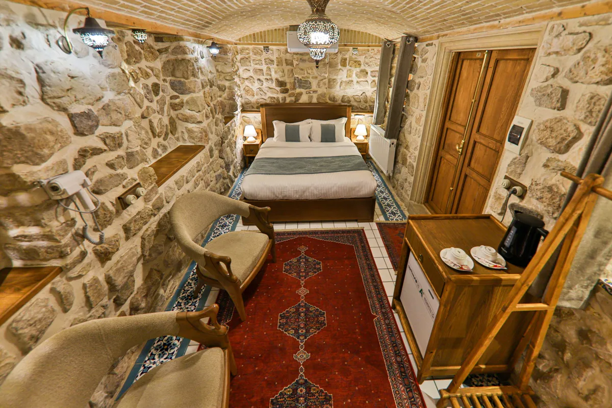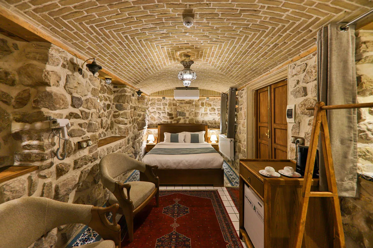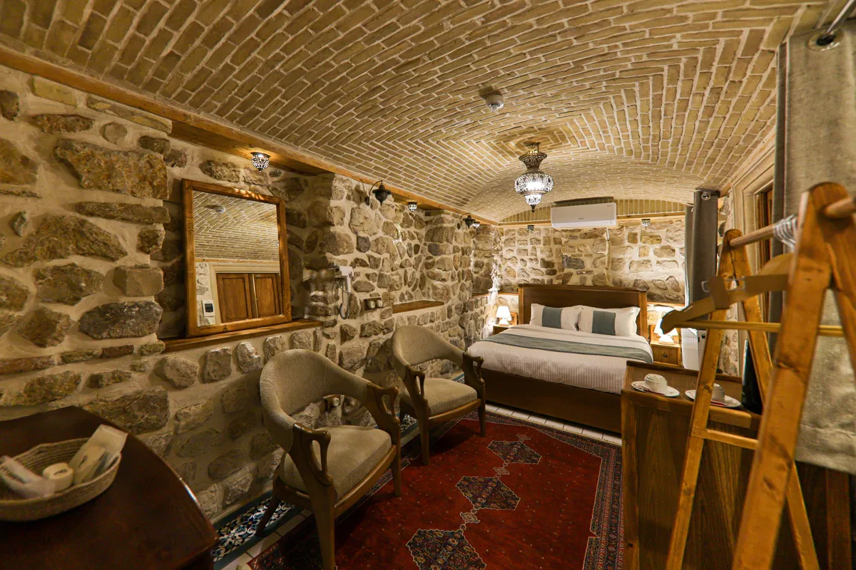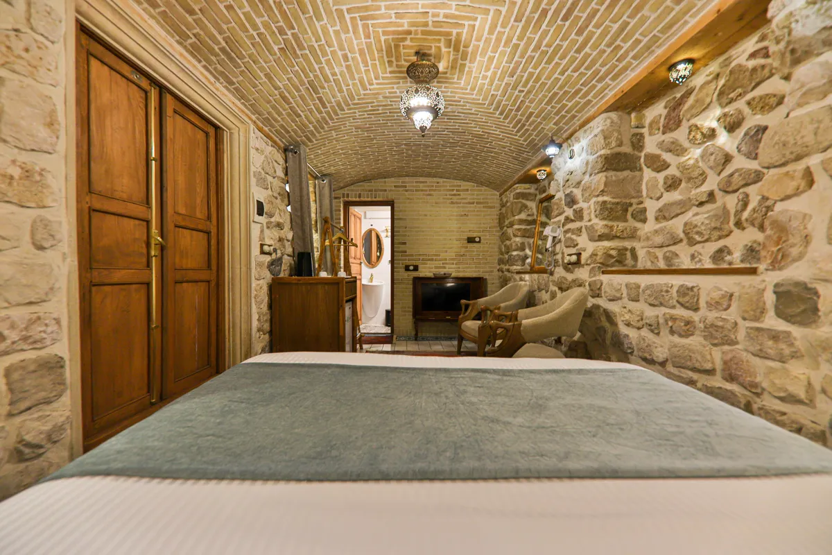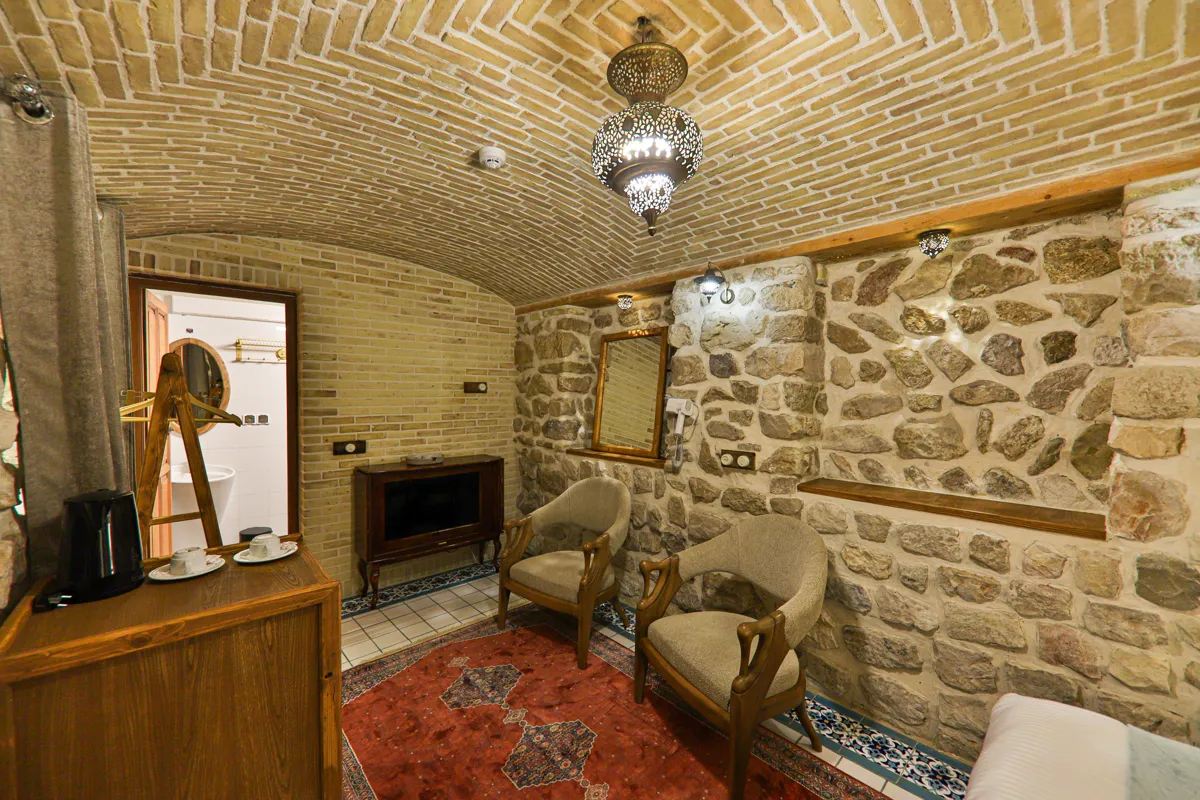 اتاق “وصال” با طراحی بینظیر خود، فضایی شاعرانه و دلنشین را برای اقامتی فراموشنشدنی فراهم کرده است. نام این اتاق از مفهوم وصال و پیوند الهام گرفته شده و نقاشیهای دیواری آن، مراسم عروسی سنتی ایرانی را با جزییاتی هنرمندانه به تصویر کشیدهاند. این نقاشیها که در قابهای طاقمانند بر روی دیوارها اجرا شدهاند، حس شکوه و اصالت را به فضا بخشیده و گویی داستانی عاشقانه را روایت میکنند. سقف اتاق یک شاهکار هنری است که با نقوش اسلیمی، گلوبوتههای ظریف و طرحهای الهامگرفته از هنر ایرانی مزین شده است. رنگهای گرم و ترکیب طرحهای سنتی، فضایی پر از حس نوستالژی و زیبایی خلق کرده است. شیشههای رنگی پنجرهها یکی دیگر از ویژگیهای برجسته این اتاق است.